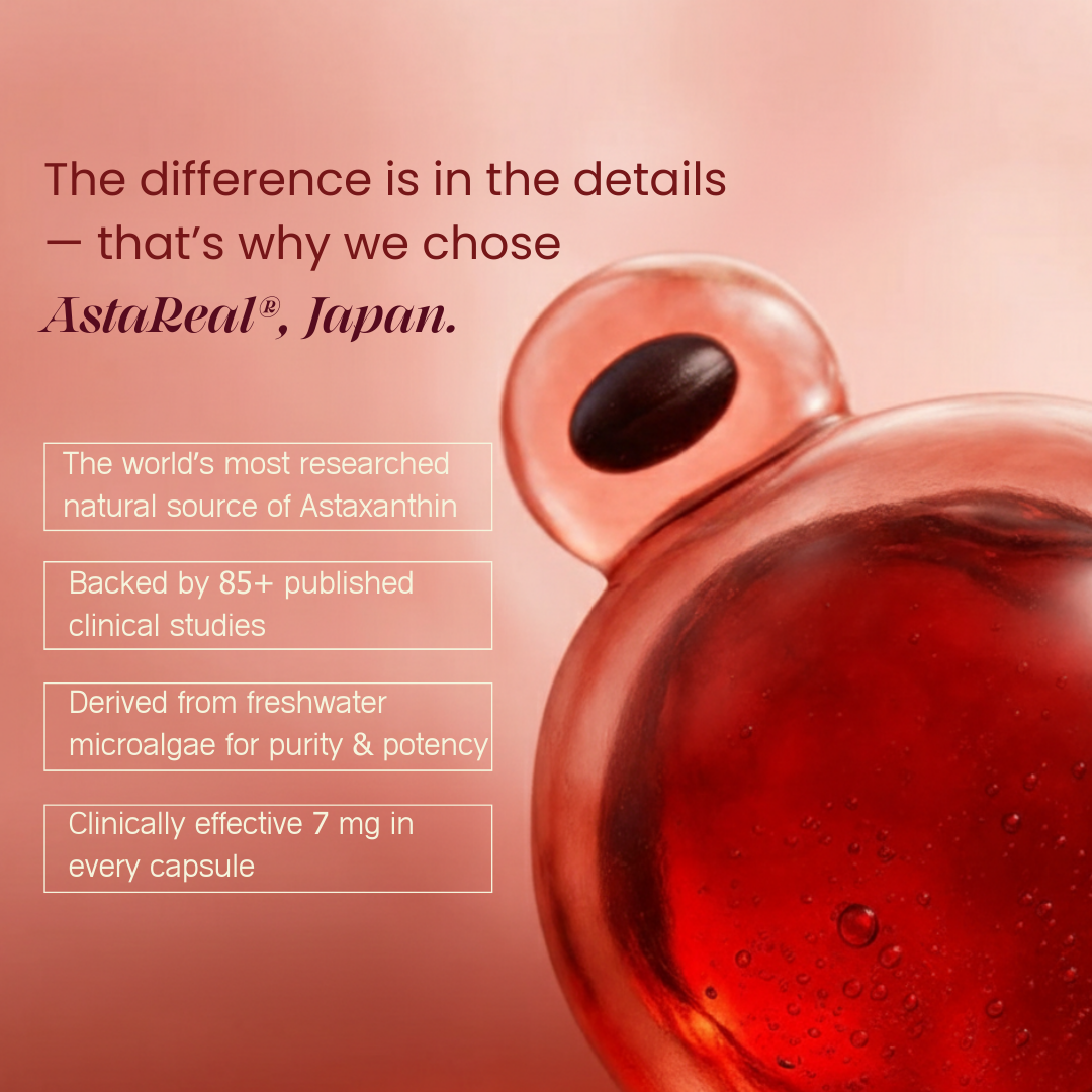 ✔ AstaReal® Astaxanthin imported from Japan – globally trusted, pharmaceutical-grade source