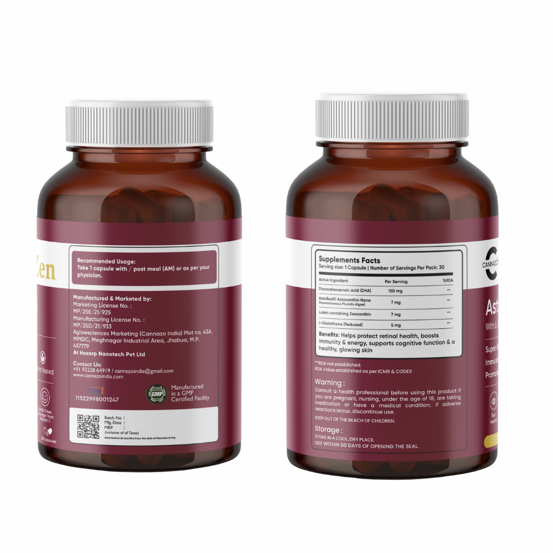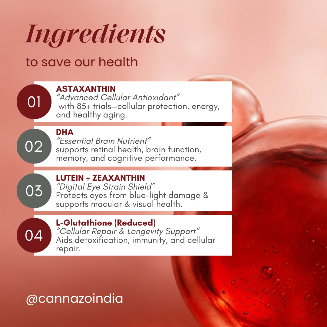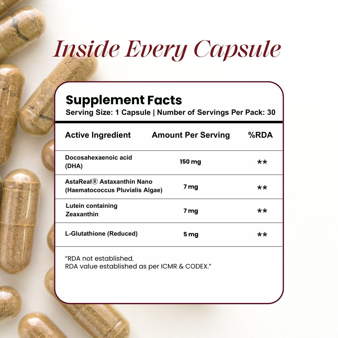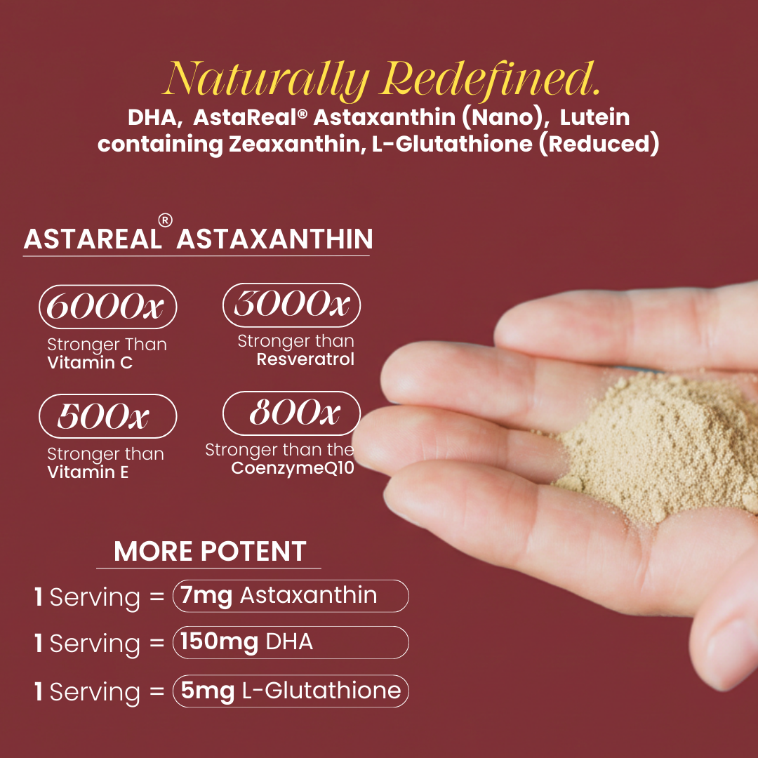 India’s first Japanese AstaReal® Astaxanthin + DHA + L-Glutathione complex— a next-generation antioxidant and omega powerhouse designed for daily anti-aging, radiant skin, and cellular vitality. Formulated with 7 mg active AstaReal® Astaxanthin (from Haematococcus pluvialis algae, Japan) and 150 mg DHA, delivering superior bioavailability and cellular protection.