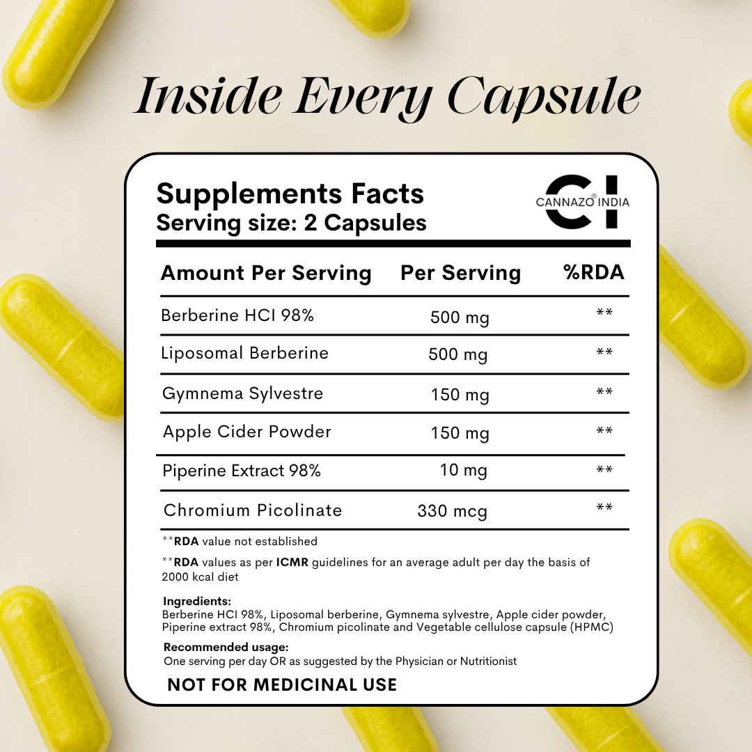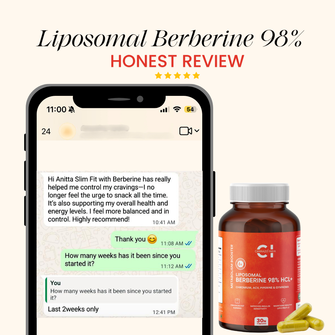 Cannazo India brings you India’s first Liposomal Berberine 98% HCl+, designed for superior absorption and effectiveness. Extracted from pure Himalayan Berberis aristata roots, this advanced formula delivers a highly bioavailable 1000 mg dose of Berberine per serving – absorbed 13.6x better than standard berberine.